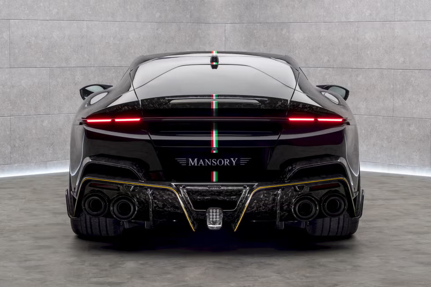 Zajímavé je, že Mansory se prý snažilo zachovat aspoň špetku elegance, takže dozadu nedalo žádné „velké aero“. To je na ně skoro meditativní zdrženlivost. I tak se ale věci děly: zadní difuzor je upravený a nese typický Mansory forged karbonový finiš. Zadek dostal také nový valved exhaust (ventilovaný výfuk), který spolu s tuningem motoru zvedá výkon na 855 hp a 538 lb-ft. Mansory navíc tvrdí, že úpravy karoserie zvýšily přítlak oproti standardu, hlavně na přídi – co to udělá s dynamikou, to podle článku ukážou až majitelé v reálném světě.