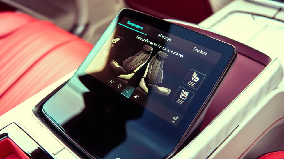 Autor říká přímo: miluje být v Celestiqu. Miluje jeho nízkou palubku s 50s-kitsch náladou a „cavalcade“ klasických Cadillaců vyrytých do víčka držáku nápojů. Líbí se mu náhodné mechanismy sklápění opěrek (i když rachotí) a „fillets“ skutečně chladného kovu, kterým se plýtvá po interiéru. Užívá si jednopádlovou rekuperaci, která funguje jako brzdový „mushroom“ ve starém Citroënu DS. A přestože přes palubku běží 55" pás obrazovek, nepůsobí to německy technokraticky; naopak: chválí audio a bufet komfortních funkcí. Chcete vyhřívaný krk, chlazená záda, „inferno“ hýždě, grilované loketní opěrky a sportovní masáž najednou? Máte to mít.